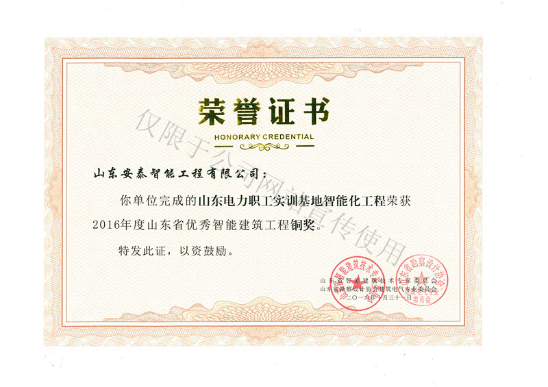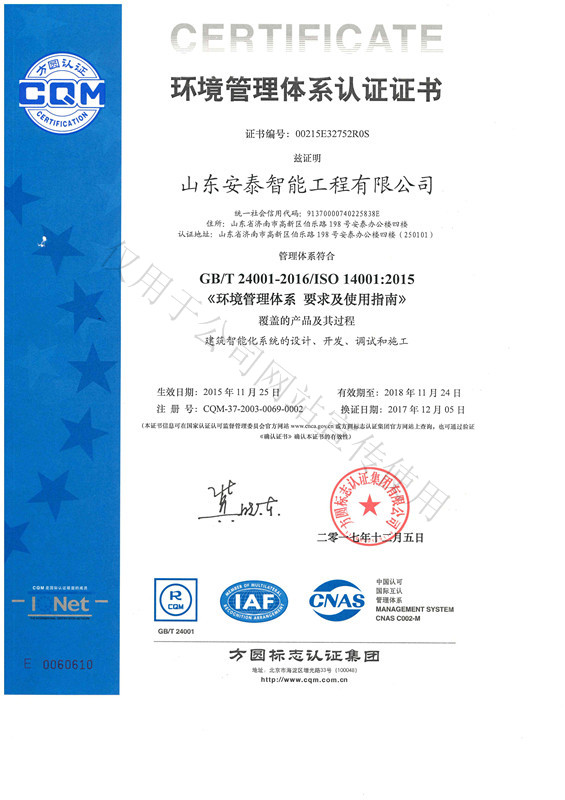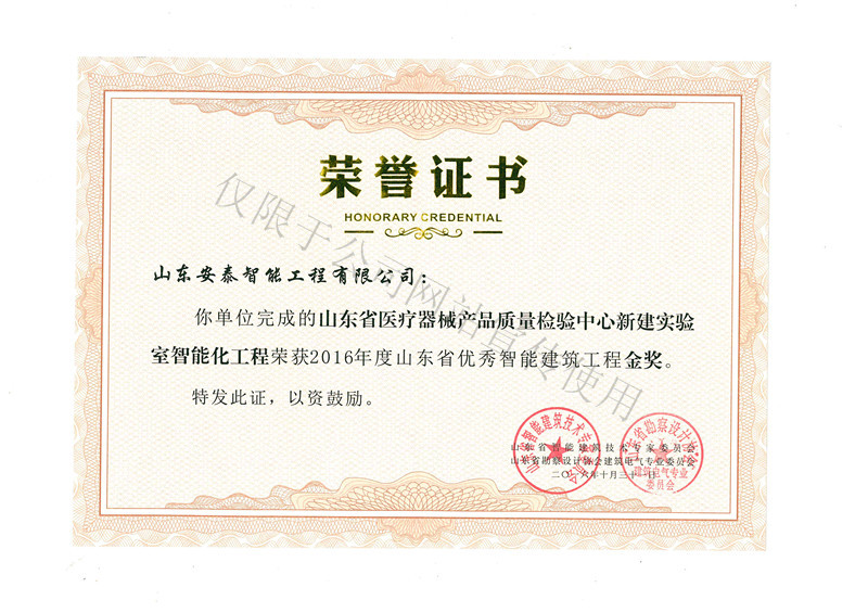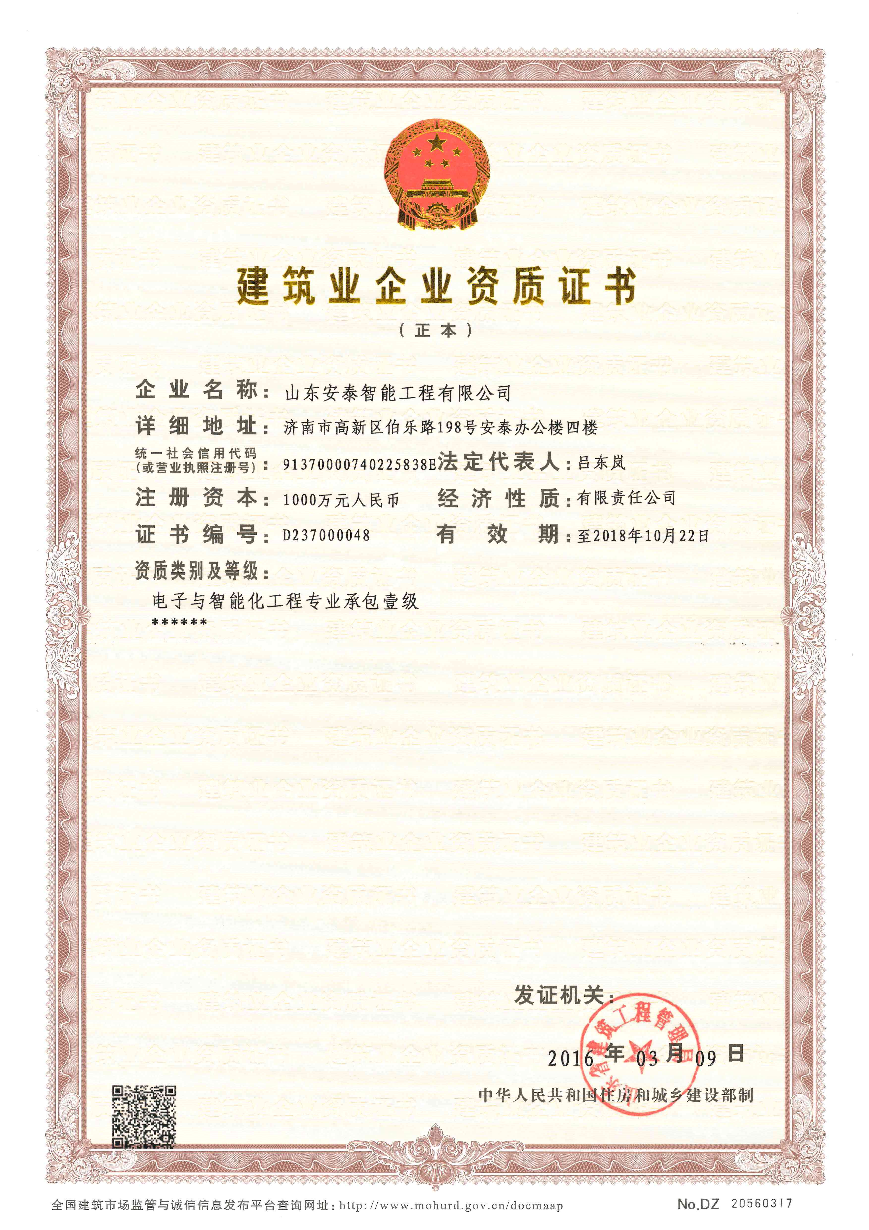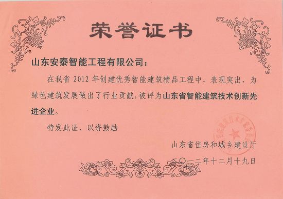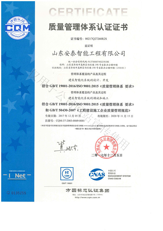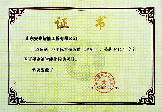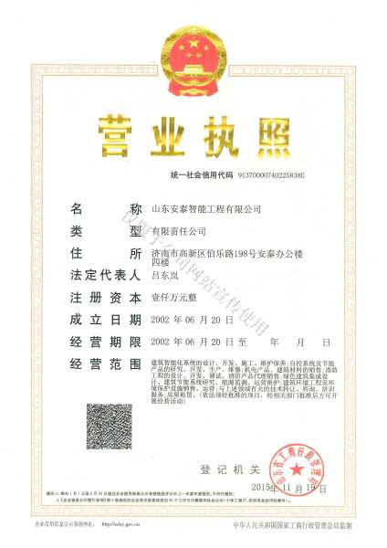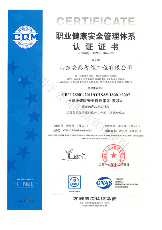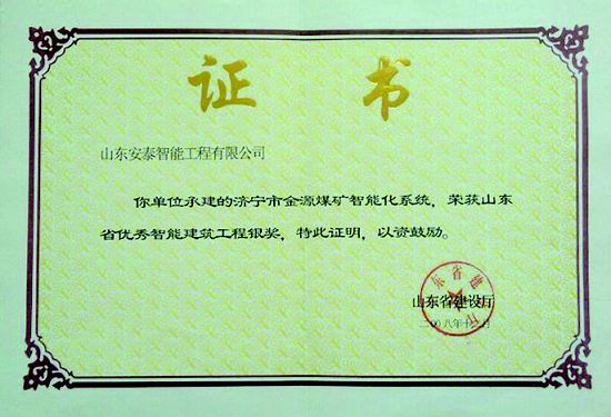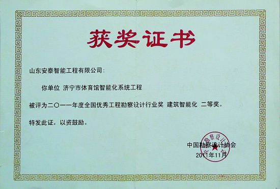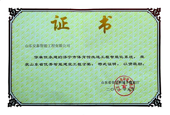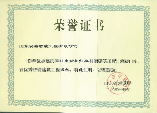 山东安泰自成立至今先后承接各类智能化专项设计与咨询业务百余项,工程二百余项,拥有《建筑智能化工程设计与施工壹级》资质、《电子工程专业承包贰级》资质、《山东省公共安全技术防范工程设计施工壹级》资质、《计算机信息系统集成企业资质》证书,ISO9001:2008标准质量管理体系认证,并于2003年被“中国勘察设计协会工程智能设计分会”聘为常务理事单位。 山东安泰一直秉承“拿着工程当课题”的质量方针,使专业水准不断提升,用优良的服务品质赢得一个个荣誉。公司参与设计施工的多个工程项目荣获“鲁班奖”、“山东省优秀智能建筑奖”、“泰山杯”、“泉城杯”、“全国百项建筑智能化经典项目”、“全国优秀工程勘察设计行业奖”等奖项,在业界树立了良好的形象并赢得了客户的广泛赞誉。资质证书